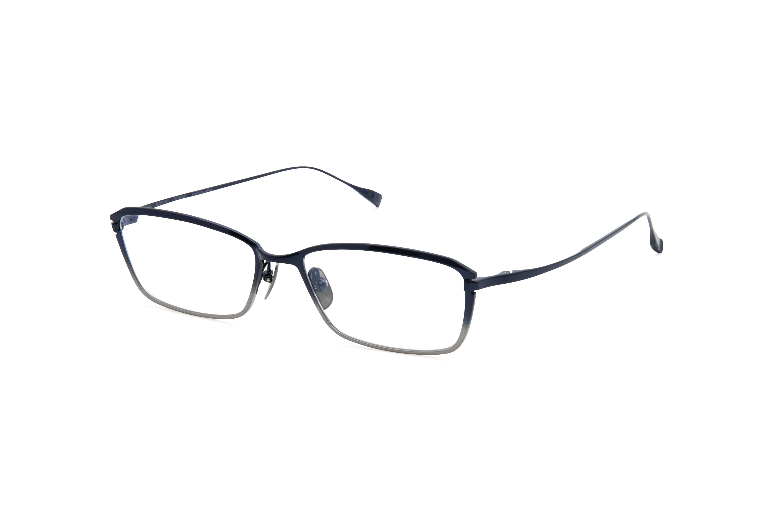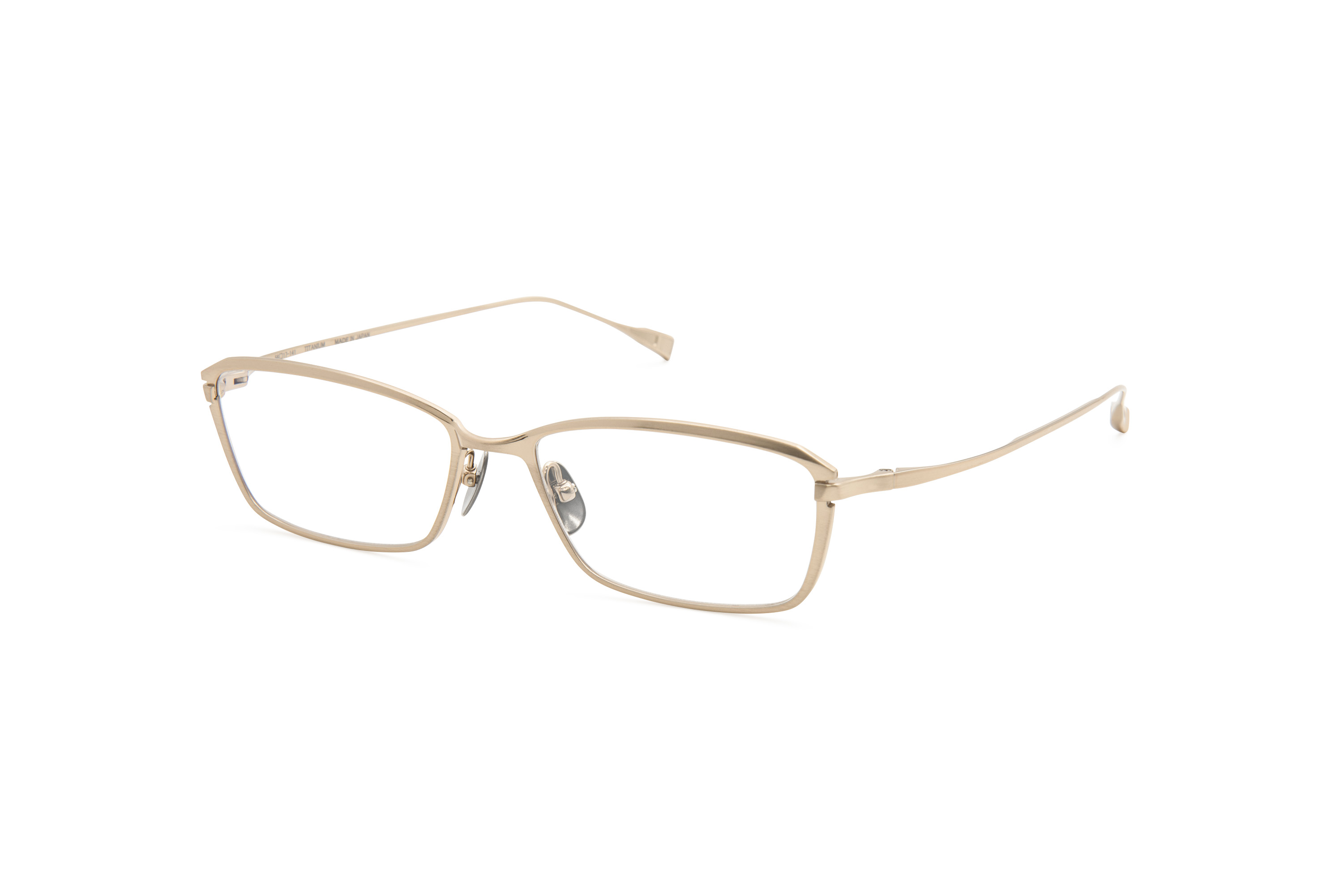 横幅を大きくもたせたLサイズのスクエアシェイプ。フロントはチタン板材をプレスと切削加工で丹念に作り上げ、特にフロント上部に施された斜め面カットはシャープで知的な印象を与えます。また、ヨロイの位置を一段下げることで程よいエッジと上質な雰囲気を兼ね備えた汎用性の高いモデルを追求しました。カラーリングは、メタルフレームの特性を活かしたソリッドな質感を表現。Col.01は耐久性に優れたIPメッキにハンドシャーリング加工を施し、深みのある独特なアンティーク感を表現。Col.02,04は熟練した職人の手作業によって美しいグラデーションカラーに染色。光の加減によって多彩な表情を見せます。Col.05は透明感を追求した顔馴染みの良いホワイトです。