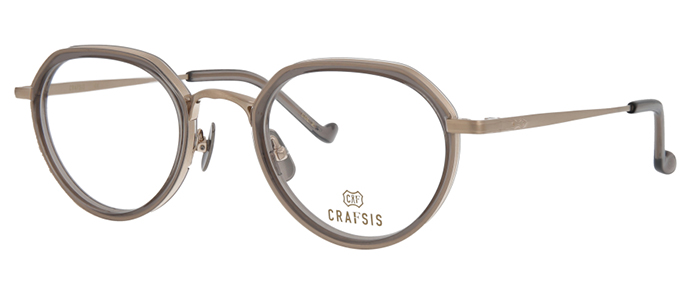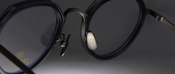 クリアやグラデーション生地のインナーリムタイプで、クラウンパントシェイプのフルリムモデル。レコードリムを採用し、立体的なブリッジには彫金風の細工を施し、レトロな雰囲気に仕上げている。鼻あてには無垢の砂打ちした(マット)チタンパッドを採用し、風合いを感じさせるデザインに機能性もプラス。また、左テンプルエンドのみにブランドロゴを施している。