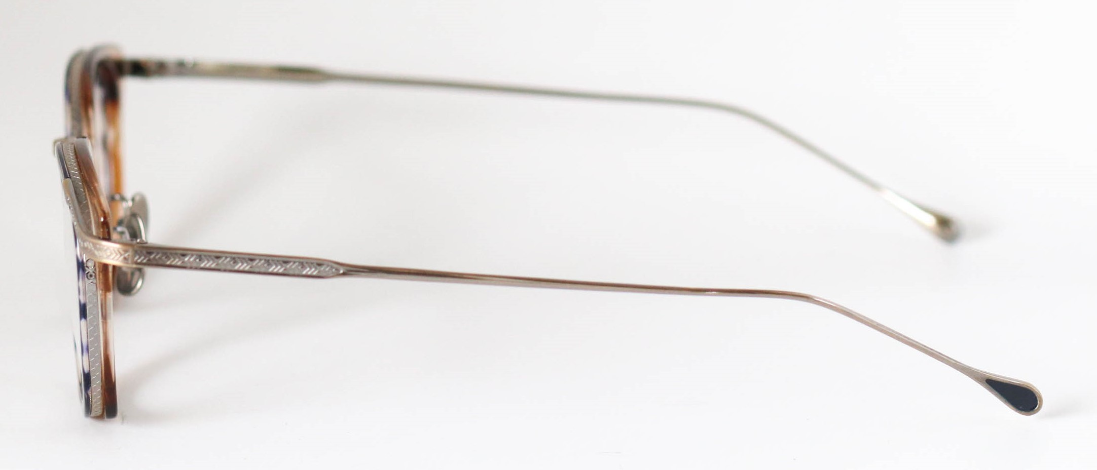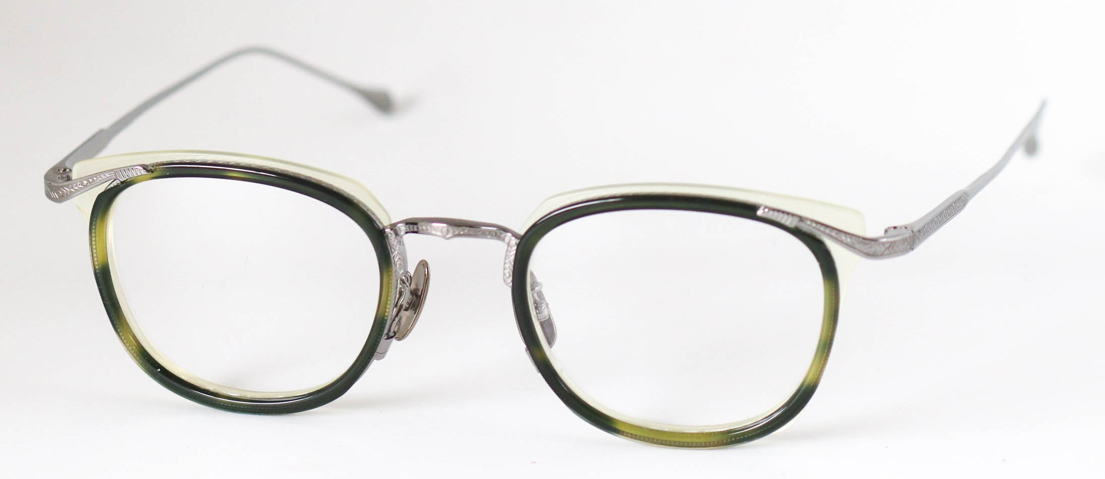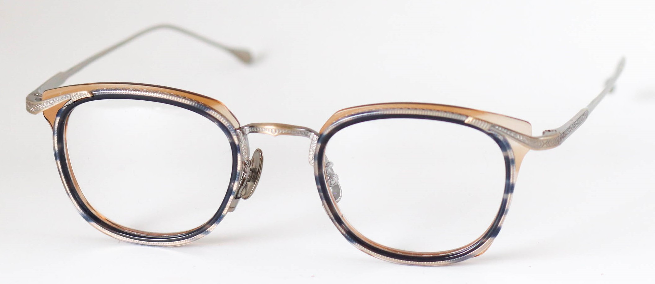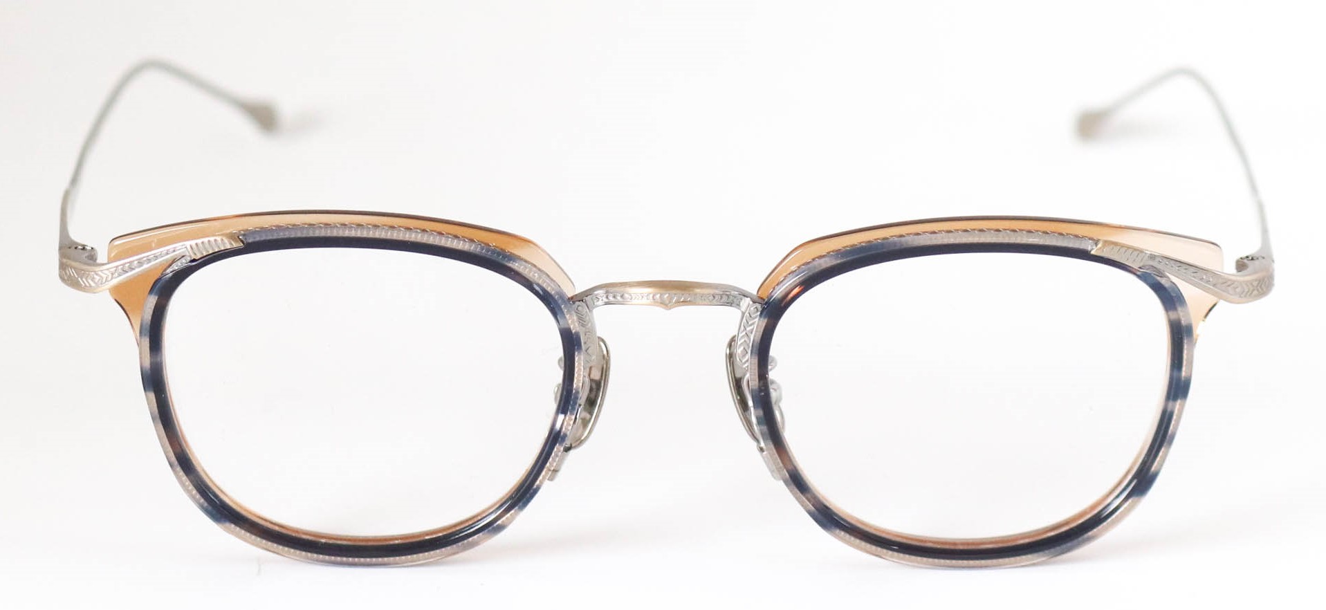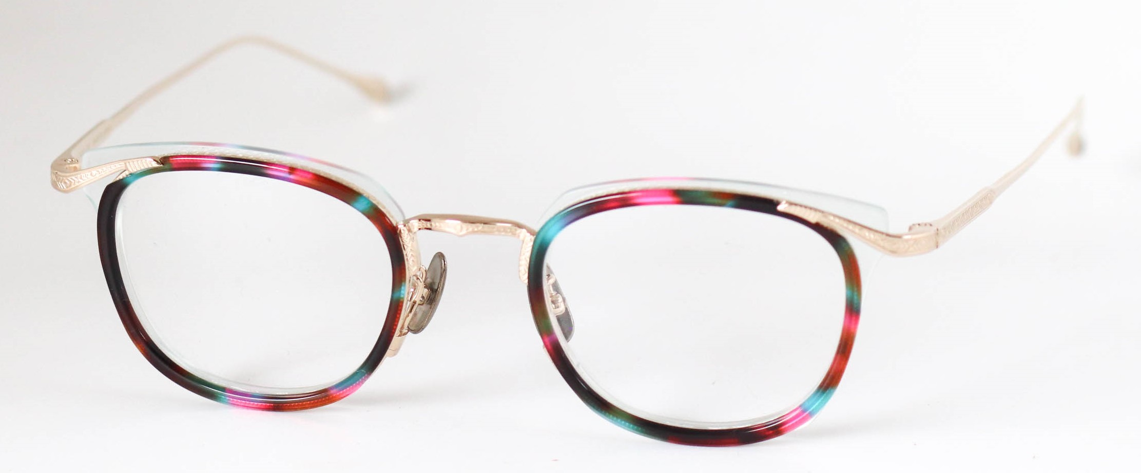 多層の綺麗なアセテートを基本に、削り出しの技術で鮮やかに魅せる独創的なつくりが魅力です。掛け心地も軽く、ノーズパットもチタン製でこだわりを感じさせてくれるモデルとなっている