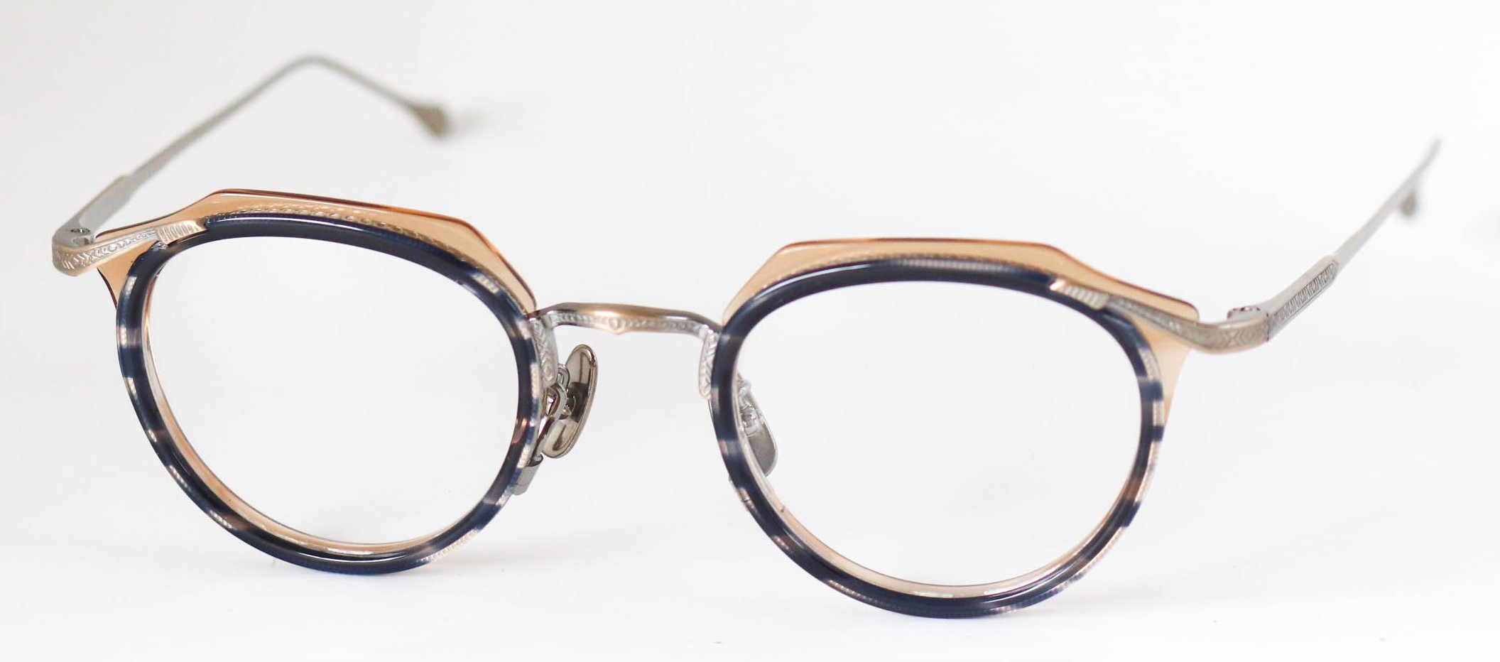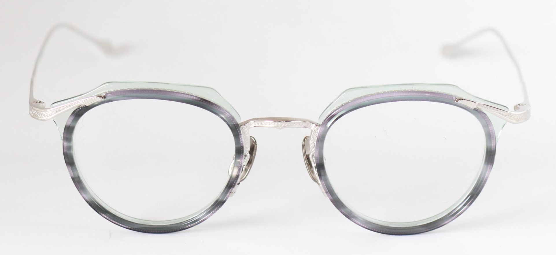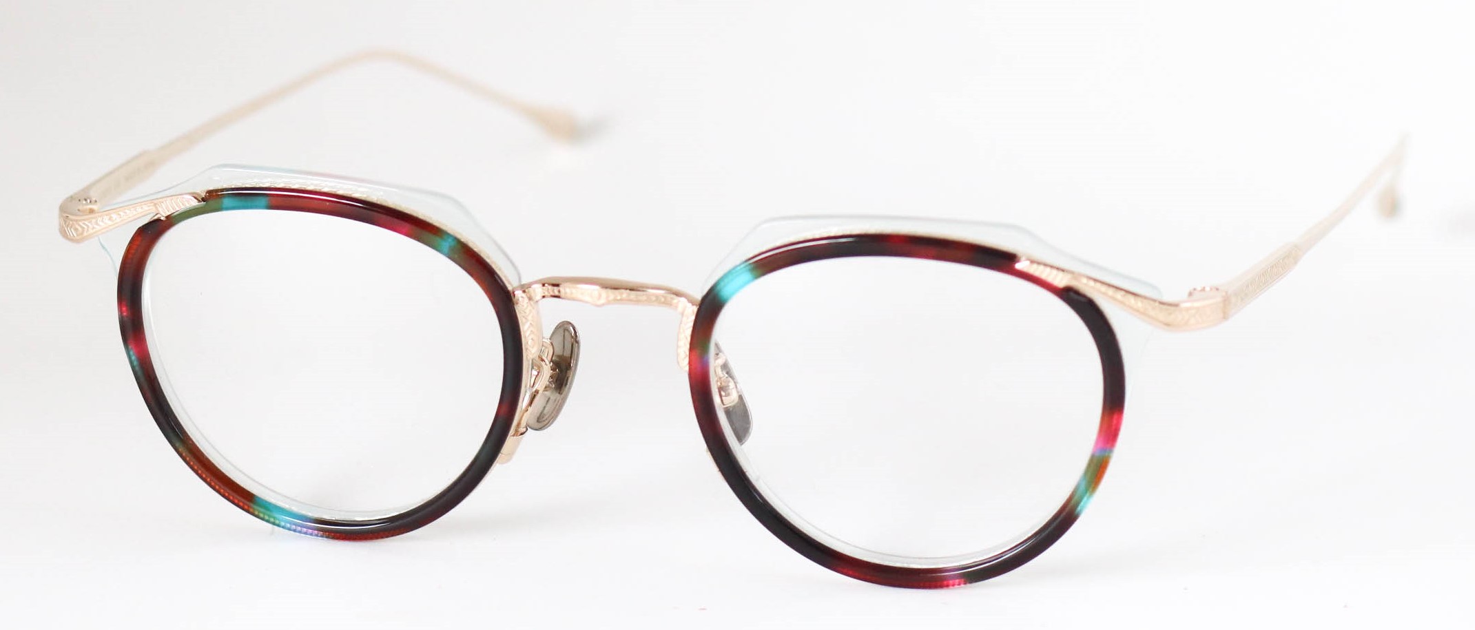 多層の綺麗なアセテートを基本に、削り出しの技術で鮮やかに魅せる独創的なつくりが魅力です。掛け心地も軽く、ノーズパットもチタン製でこだわりを感じさせてくれるモデルとなっている