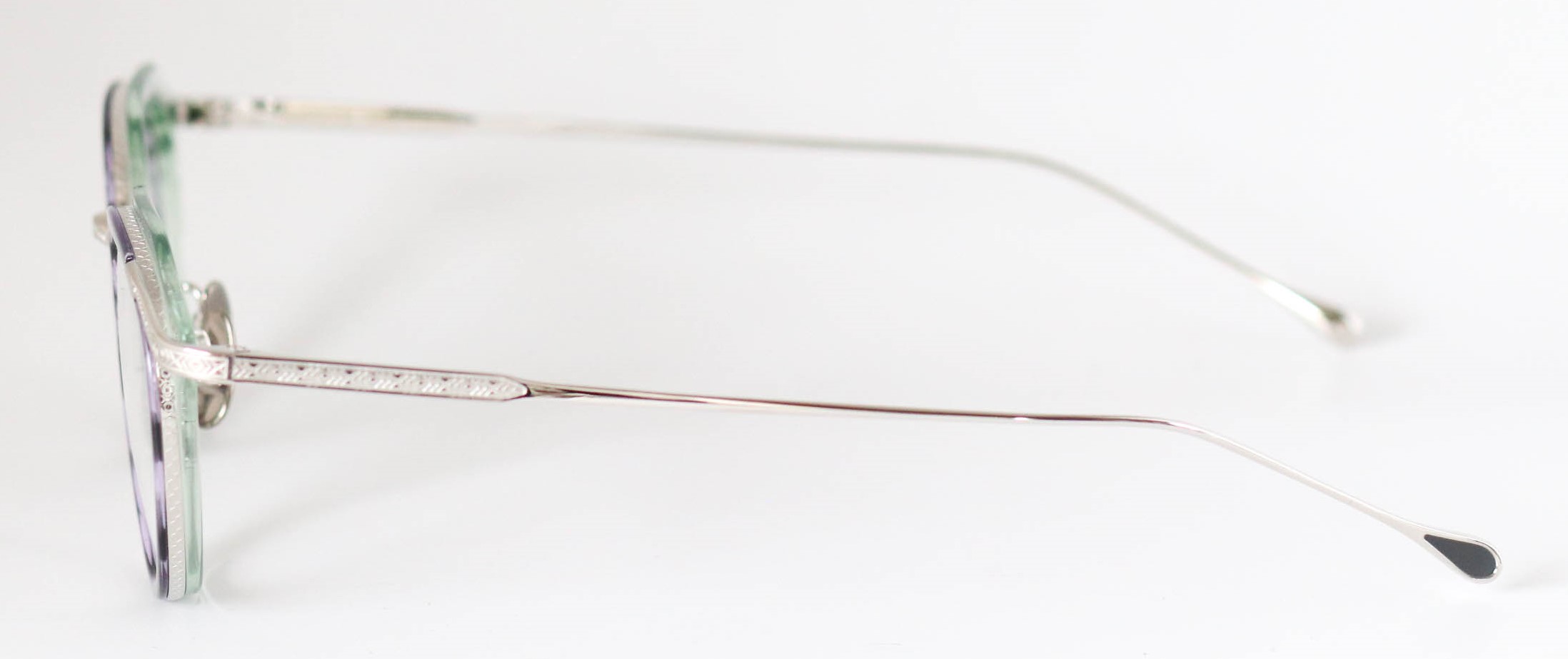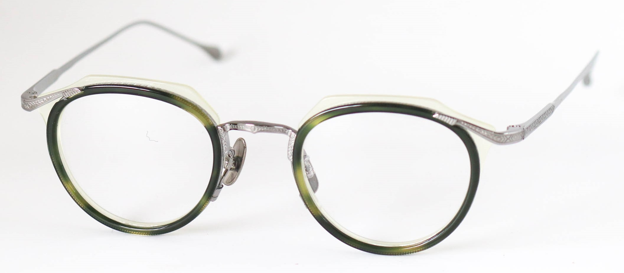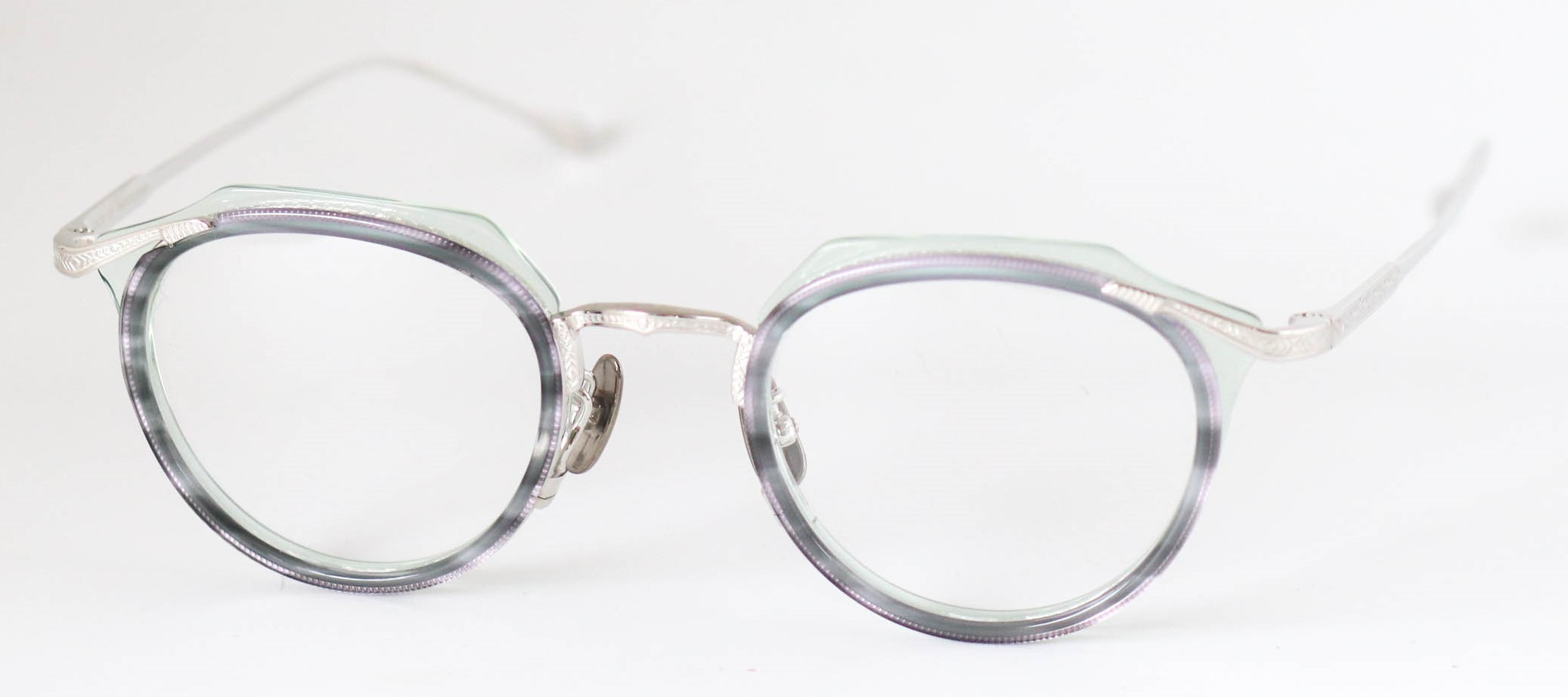 多層の綺麗なアセテートを基本に、削り出しの技術で鮮やかに魅せる独創的なつくりが魅力です。掛け心地も軽く、ノーズパットもチタン製でこだわりを感じさせてくれるモデルとなっている