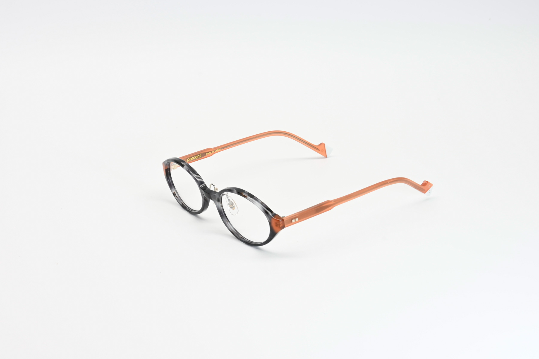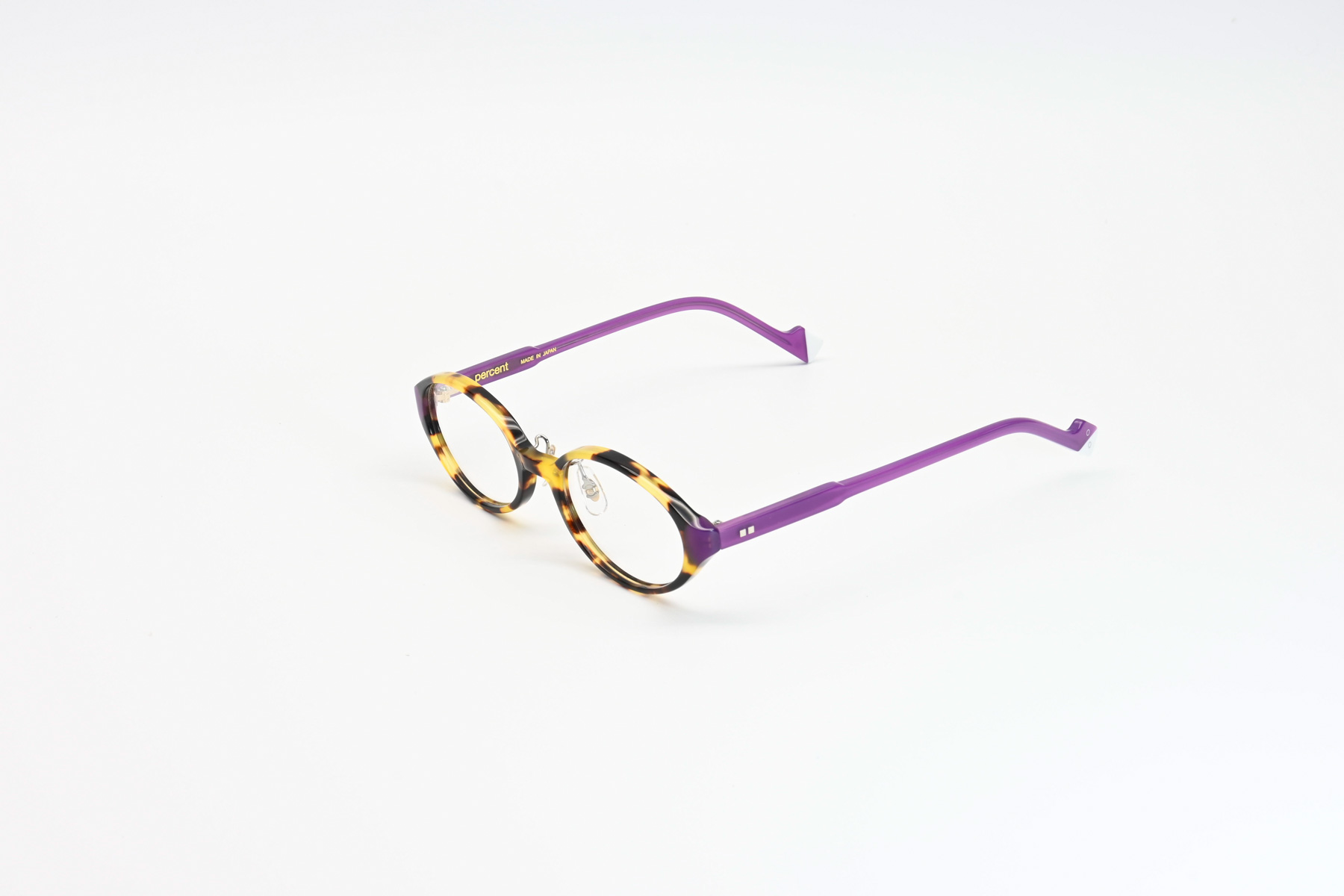 プラスジャックの新ブランド「PERCENT」。鮮やかなアセテート生地をパズル状に貼あわせ、現代的なカジュアルカラーに仕上げクラシックフレームの落ち着いたカラーとは一線を画すファッションフレーム
