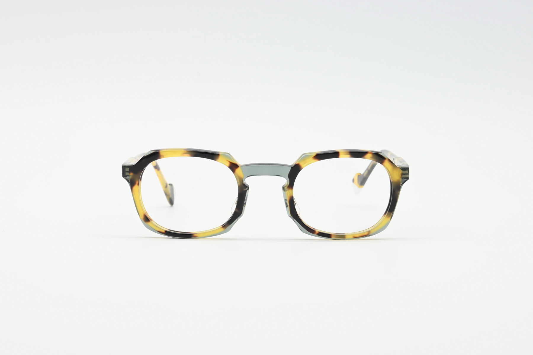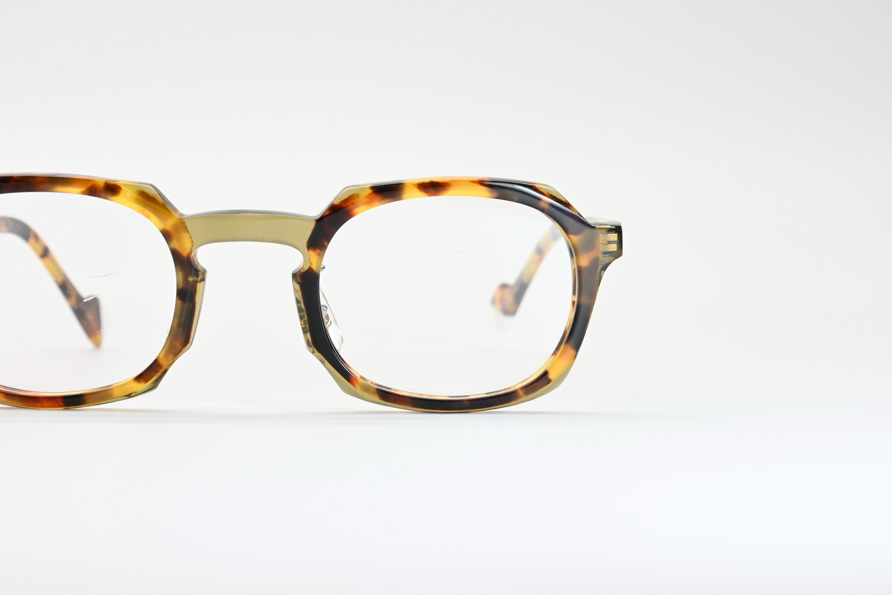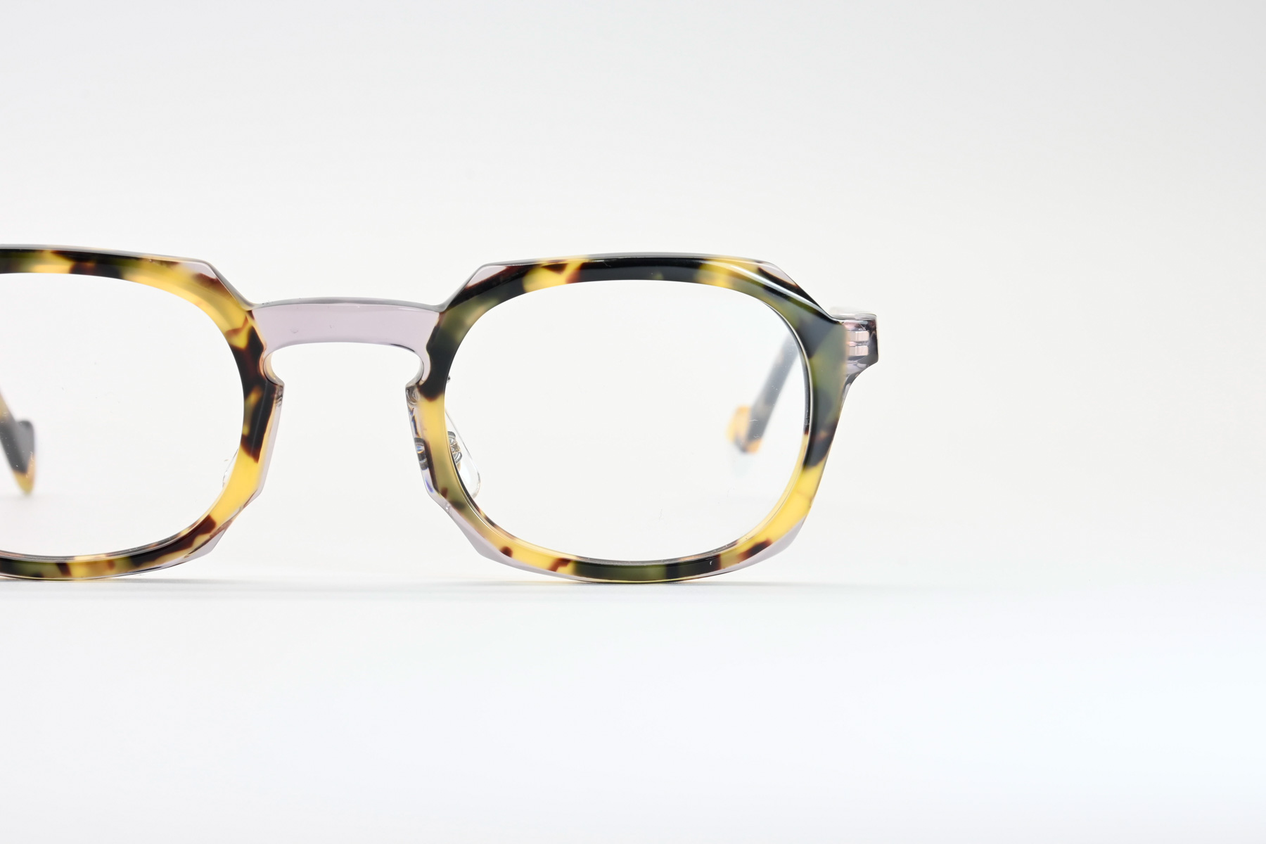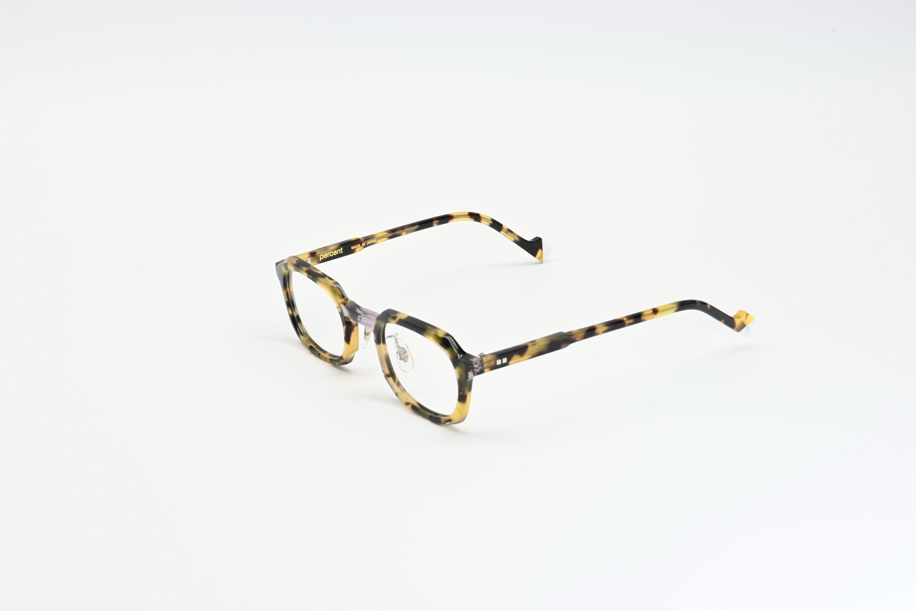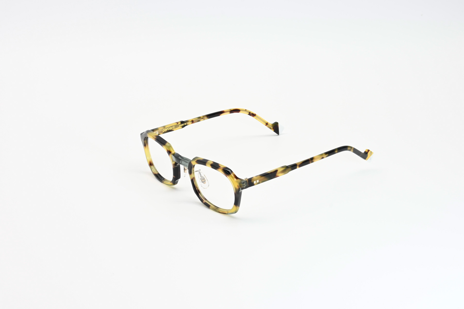 プラスジャックの新ブランド「PERCENT」。鮮やかなアセテート生地をパズル状に貼あわせ、現代的なカジュアルカラーに仕上げクラシックフレームの落ち着いたカラーとは一線を画すファッションフレーム