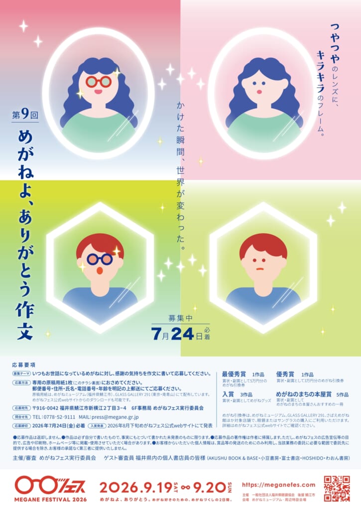 めがねにまつわる思い出や、感謝の言葉などを専用の用紙に記入してご応募ください。最優秀賞には全国47店舗の対象店舗でご利用いただける5万円のめがね引き換え券を進呈します。受賞作品はめがねフェスのwebサイト、ラジオ番組でもご紹介させていただきます。